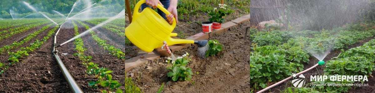 Первый и самый главный полив проводят во время посадки рассады клубники на грядку. В посадочную лунку наливают воду и дают ей полностью впитаться.