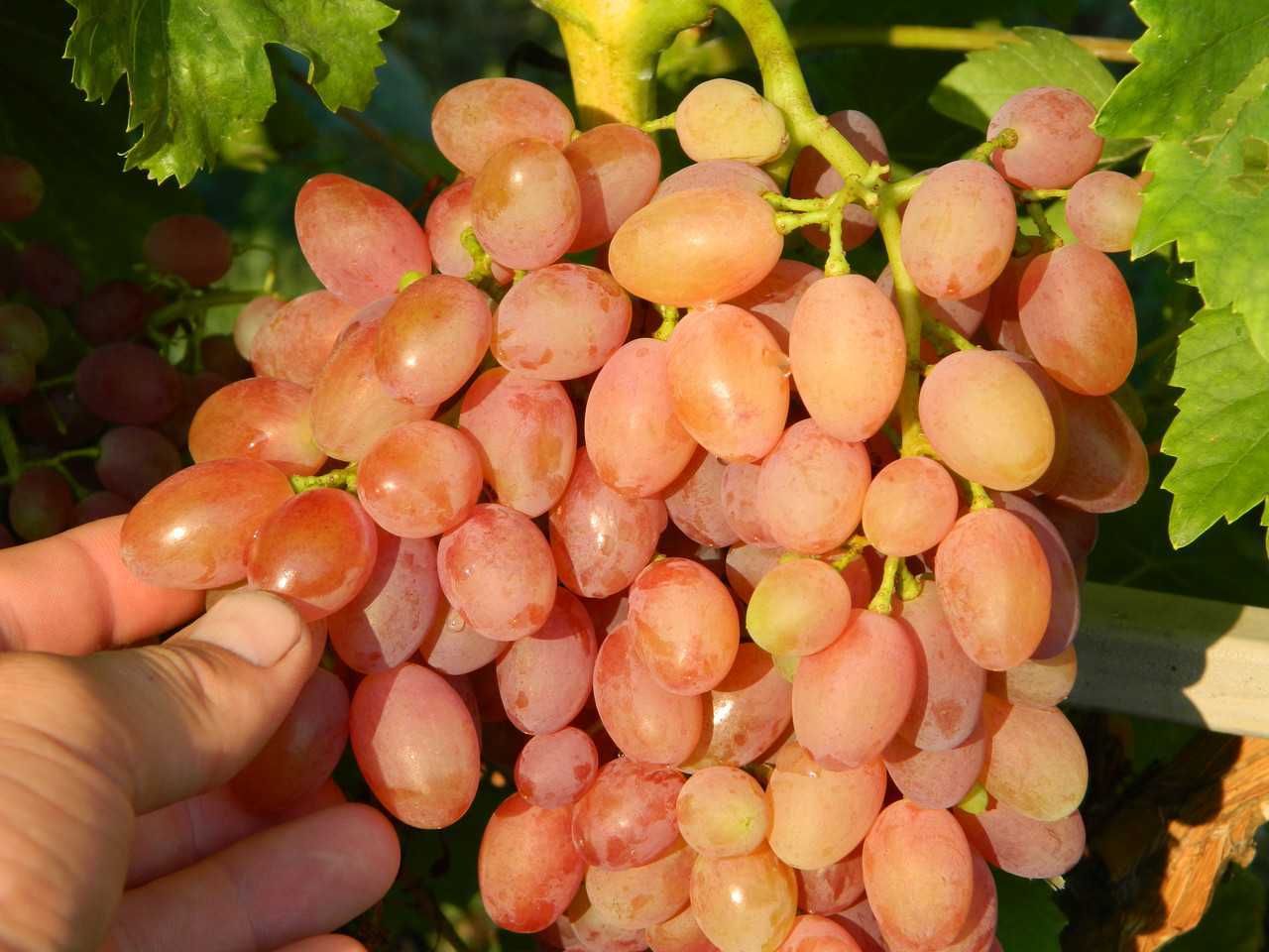 - Ягоды – форма ягод овально-удлиненная длина 20–23 мм, диаметр 17–18 мм. Масса одной ягодки примерно 4 г, цвет – розовый с небольшим красноватым, либо золотистым оттенком. Мякоть очень сочная и сладкая с приятной кислинкой, консистенция плотная с легким мускатным привкусом. Количество сахара 19–22%, кислоты около 7%. Косточки полностью отсутствуют. Оценка вкусовых качеств 9,8 баллов из 10.