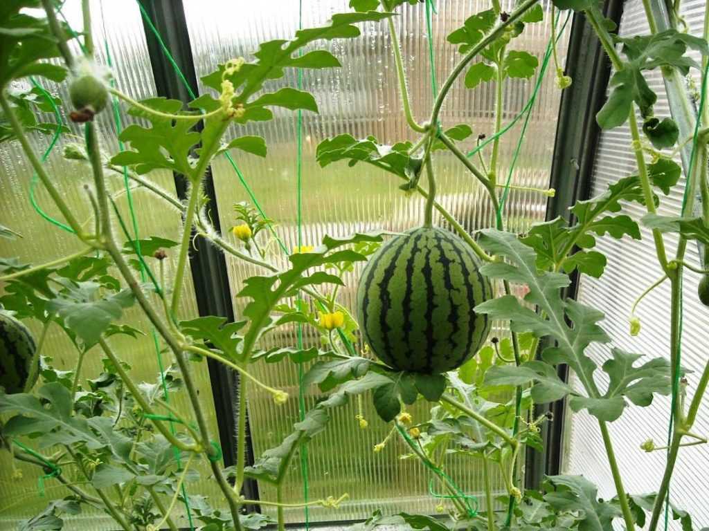 Для арбузных посадок, размещаемых в теплице, требуется шпалера. В жаркую погоду тепличное помещение из поликарбоната необходимо проветривать. Вода для полива должна быть выше комнатной температуры. Следует следить, чтобы вода не попадала на растения.