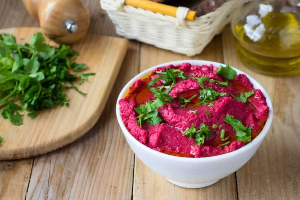 Нежная свекольная паста с кислинкой и ореховым послевкусием содержит 153 калории в 100 г. Она подходит к оладьям, чипсам и тостам.
