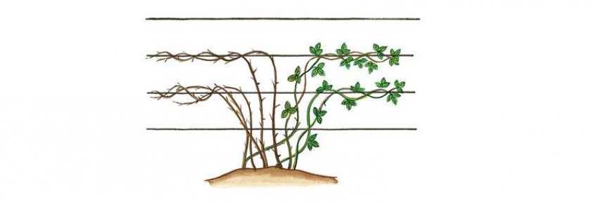 Так как ежевика — это многоствольный кустарник, то каждый новый побег текущего года, если его укоротили, на следующий год сформирует на верхушке несколько ветвей и станет похож на рогатину. Чтобы ветви не гнулись под весом ягод, их подвязывают к обычной шпалере.