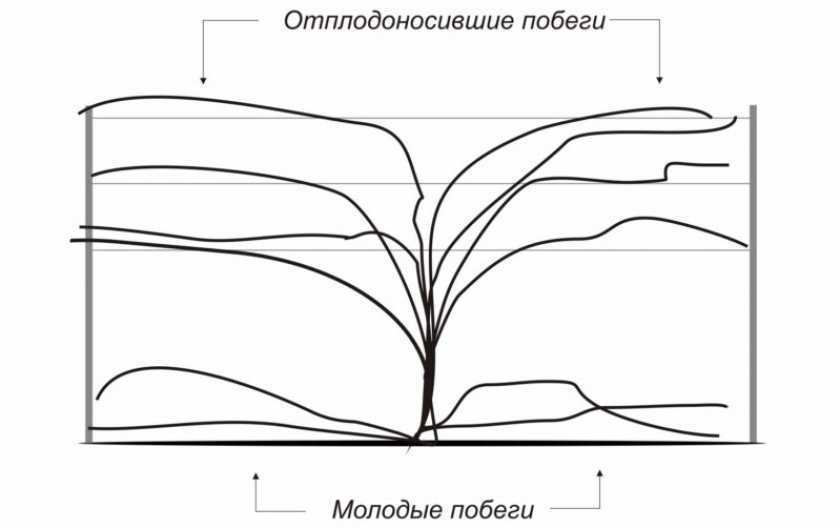 - Чередующееся формирование с разделением куста на две части. Плодоносящие побеги подвязываются на шпалеру с одной стороны от оси куста, а молодые ветки – по другую сторону. В зависимости от количества побегов каждый ряд проволоки может быть опорой для одного, либо нескольких побегов. Преждевременные молодые боковые ветки удаляют. После сбора урожая ягод все плодоносящие стебли с одной стороны куста обрезают, а на смену им в следующем году подвязывают побеги замещения. Эту процедуру повторяют каждый год.