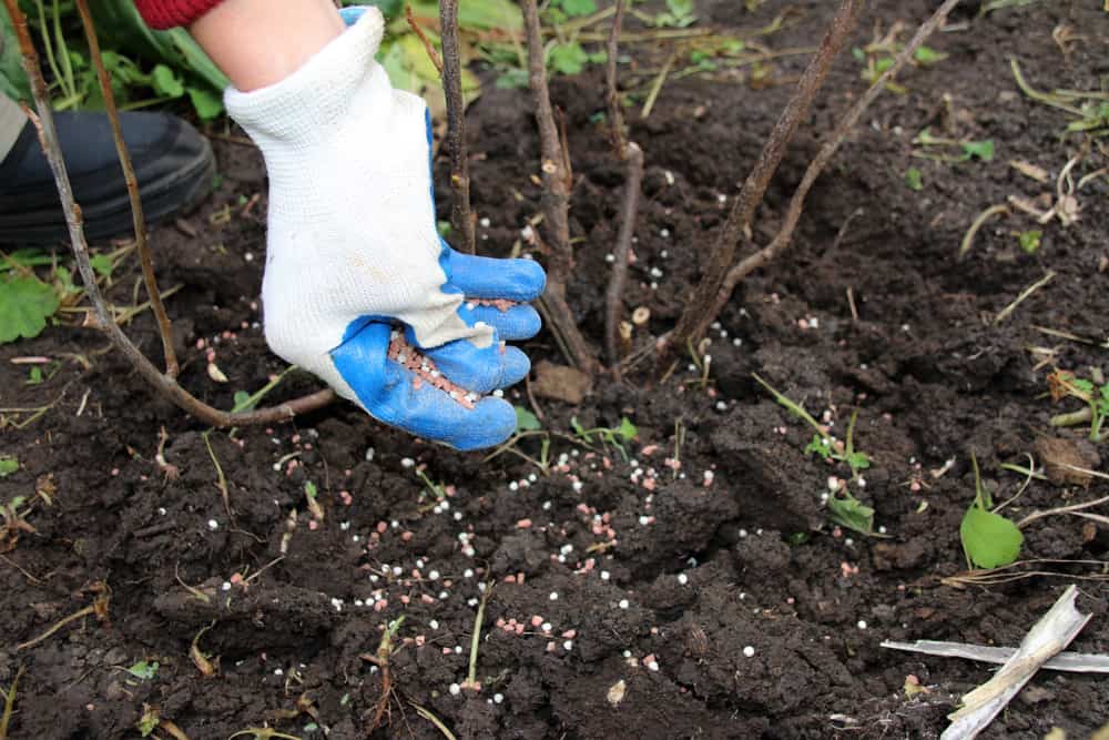 - Вносят калийно-фосфорные удобрения. Вокруг куста делают бороздки на расстоянии 30 см и глубиной 20 см. В них вносят суперфосфат (50 г) и соль калийную (40 г). Вещества обеспечат закладку цветочных почек и увеличение будущего урожая.