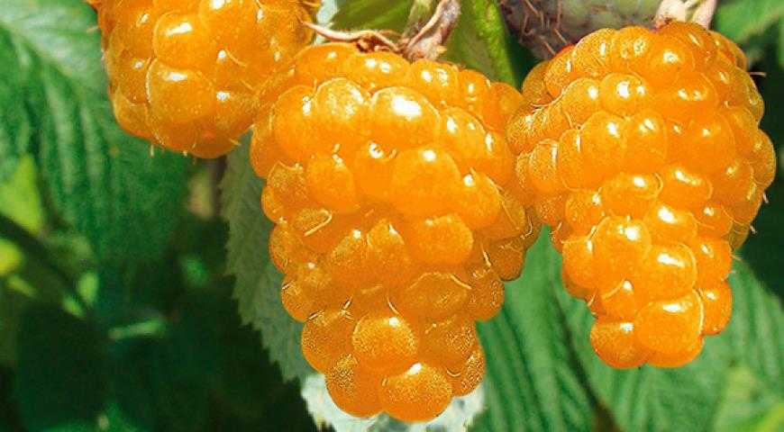 Сорт исключительный во всех отношениях: красивые золотисто-желтые ягоды огромных размеров с отличным вкусом и ароматом лесной малины. Ягоды до 12, а то и 14 г. Сочная, сладкая и ароматная мякоть. Зрелые ягоды приобретают красивый темно-золотистый оттенок, делая малинник еще красивее и привлекательнее. Срок созревания средний, урожайность до 8 кг/куст. Куст рослый, с мощными малошипными побегами высотой 1,5–1,8 м.