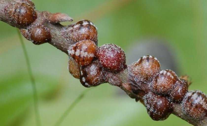 Определить появление ложнощитовки можно по выпуклым тёмно-коричневым щиткам на поверхности побегов, из которых в дальнейшем появляется вредитель.
