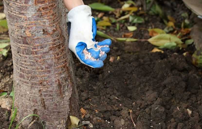 В первые 2 года после посадки вишнёвое дерево не требует дополнительного удобрения, ведь ему достаточно питательных веществ, которые были внесены при высадке в грунт. Удобрение начинают вносить с 3 года роста в весенний период. В средине апреля проводится первая подкормка, которая является азотсодержащей, её вносят под перекопку. Используют сульфат аммония, в количестве 25 г на квадратный метр.