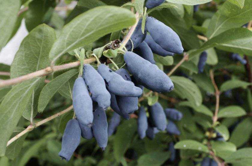 Наиболее популярен крупноплодный сорт съедобной жимолости Бакчарский великан — созревают ягоды в средние сроки. Рекомендован для выращивания в Подмосковье, средней полосе России, а также других регионах, где нижняя отметка не превышает 35°С мороза. Длина ягод этого сорта достигает 4-5 см, вкусовые качества очень высокие — по дегустационной оценке 4,8 балла. Сорт устойчив к болезням и вредителям. Как недостаток, спелые ягоды немного осыпаются. Пожалуй, это лучшая жимолость для Подмосковья, Ленинградской области и всей средней полосы.